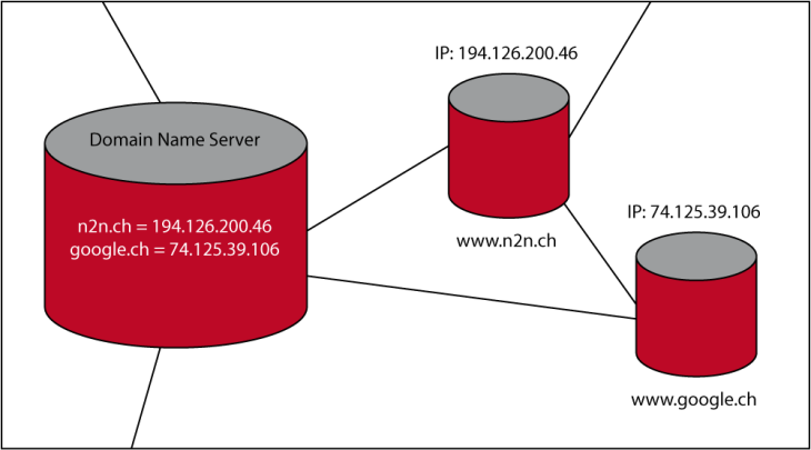 Das Internet besteht aus vielen Computern (Server), welche miteinander vernetzt sind. Jeder dieser Server hat eine eindeutige Adresse, bestehend aus Nummern (z.B. 80.74.145.70). Diese Adresse nennt man IP. Für den Internetnutzer wäre es sehr umständlich, wenn er für das Abrufen einer Website eine IP-Adresse eingeben müsste. Deshalb gibt es Domains (z.B. hnm.ch). Eine Domain wird über einen Domain-Name-Service (DNS) einer IP zugeordnet.