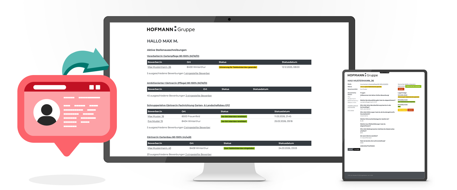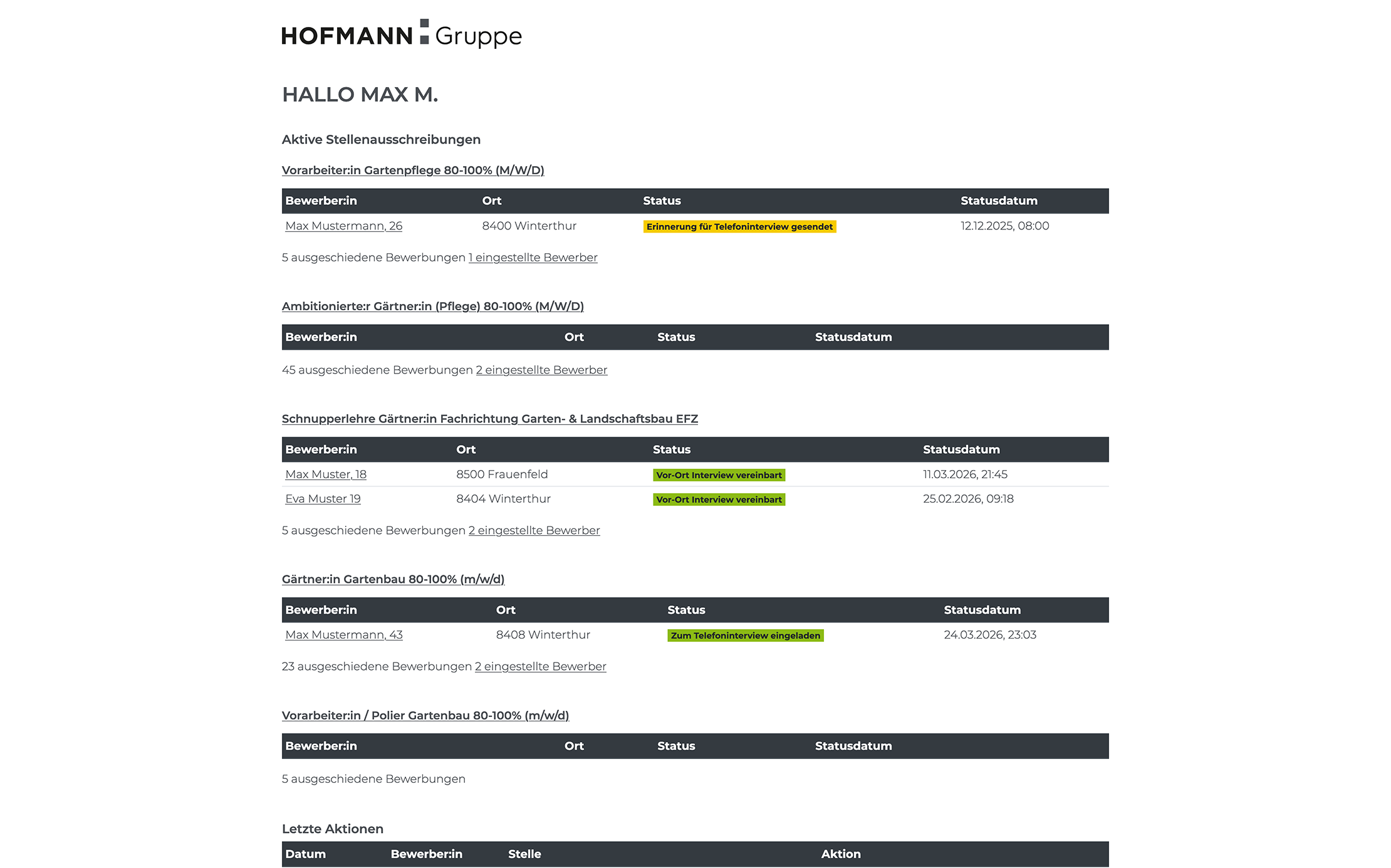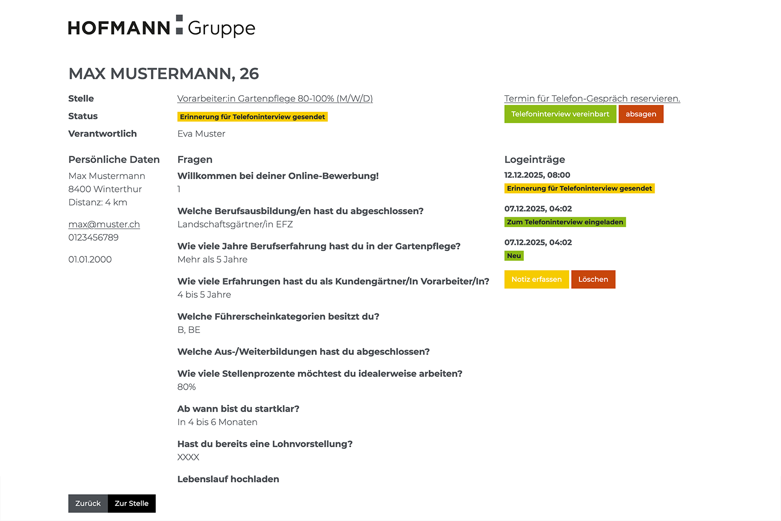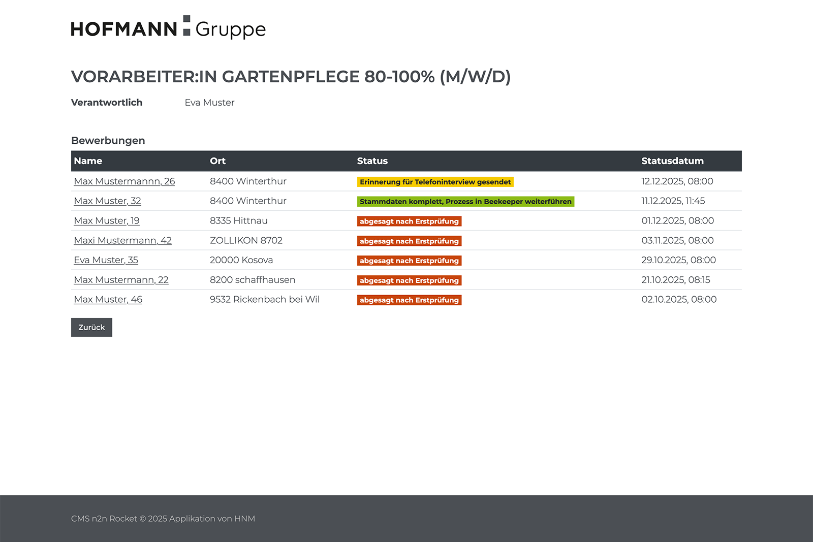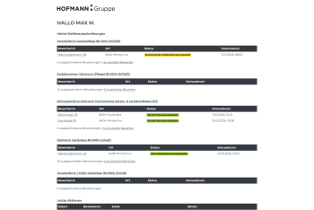 Die Personalverantwortlichen der Hofmann Gruppe haben im Backend die Möglichkeit, bei allen Jobs, wo sie zuständig sind, sämtliche Bewerbungen einzusehen. Sie können bei jeder Bewerbung manuell eingreifen und den Status anpassen.