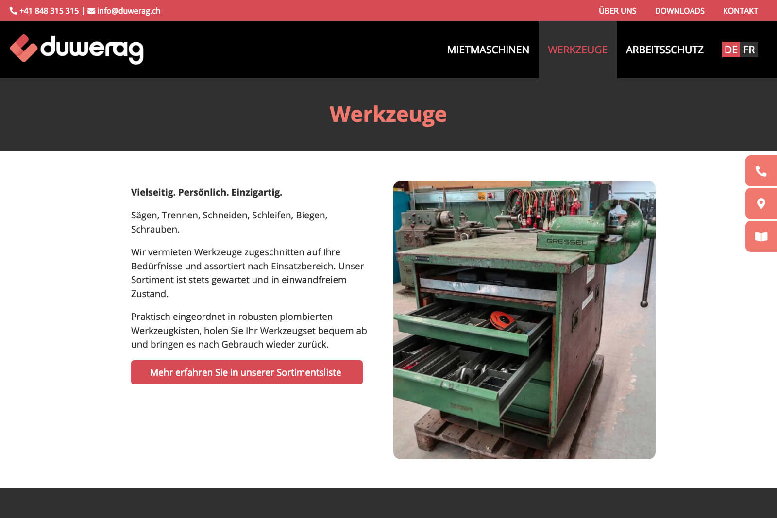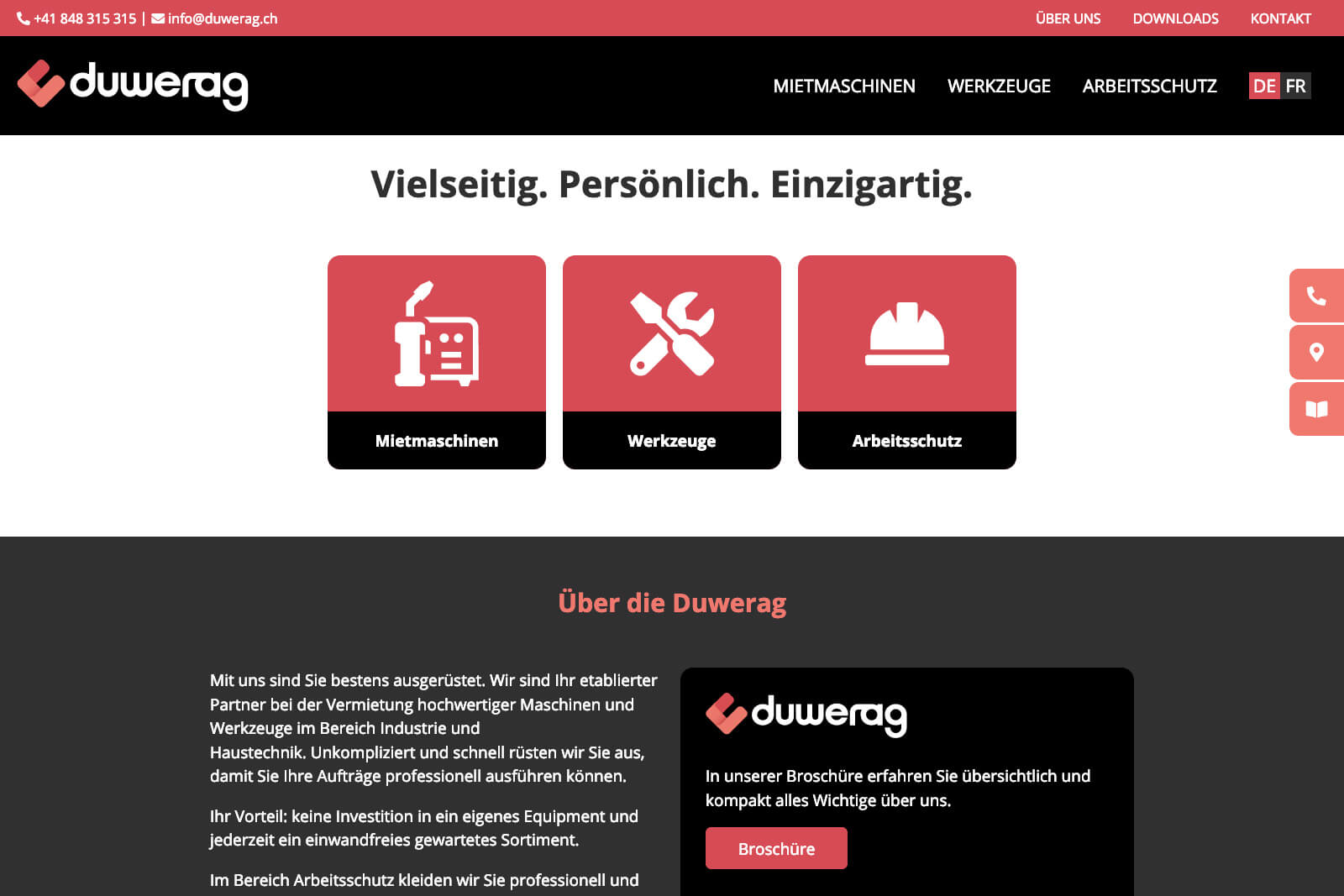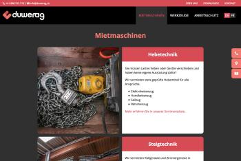 Die Duwerag ist in die Bereiche Mietmaschinen und Werkzeuge sowie Arbeitsschutz unterteilt. Als etablierter Partner in der Schweiz bietet Duwerag hochwertige Maschinen und Werkzeuge im Bereich Industrie und Haustechnik zur Vermietung an.
