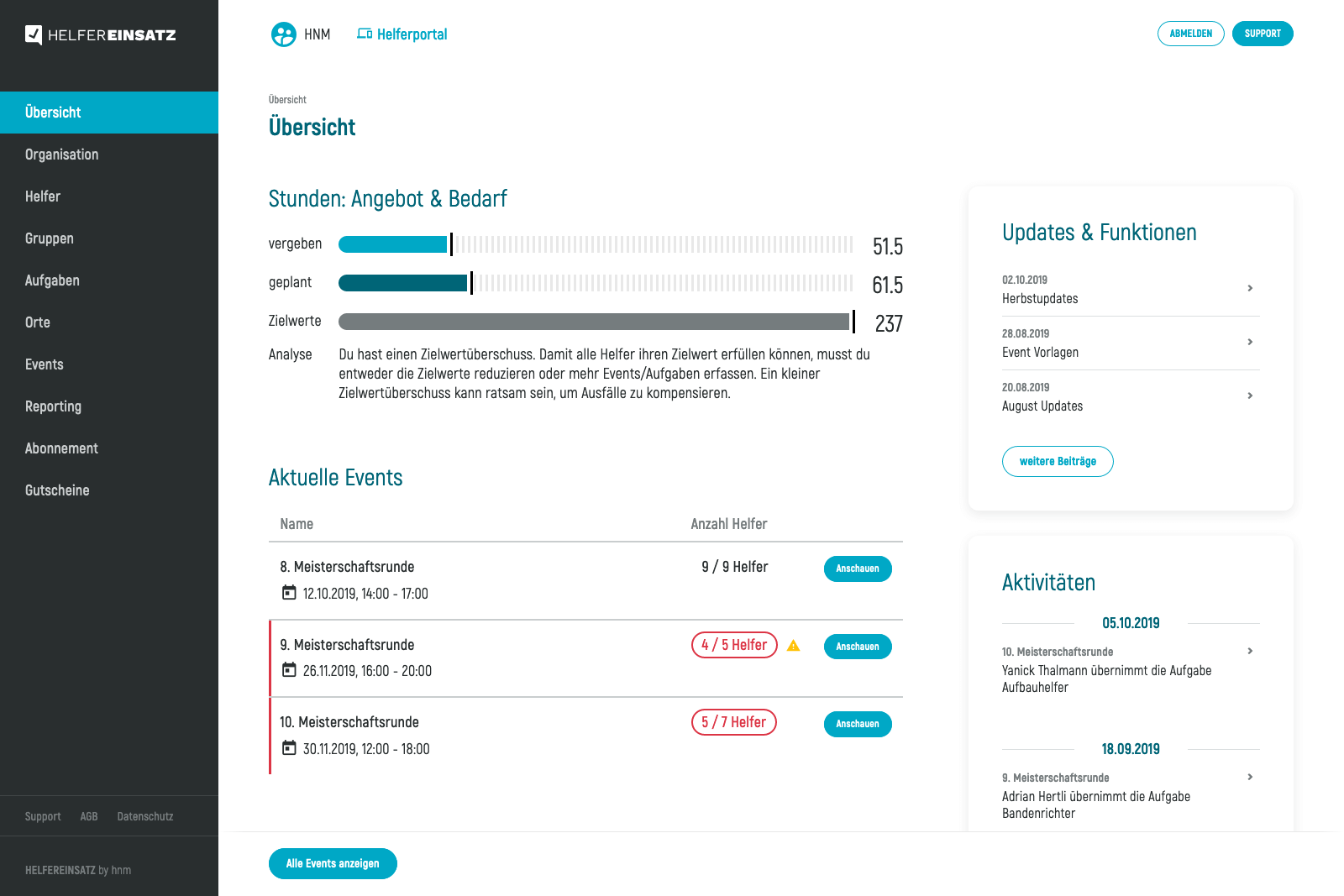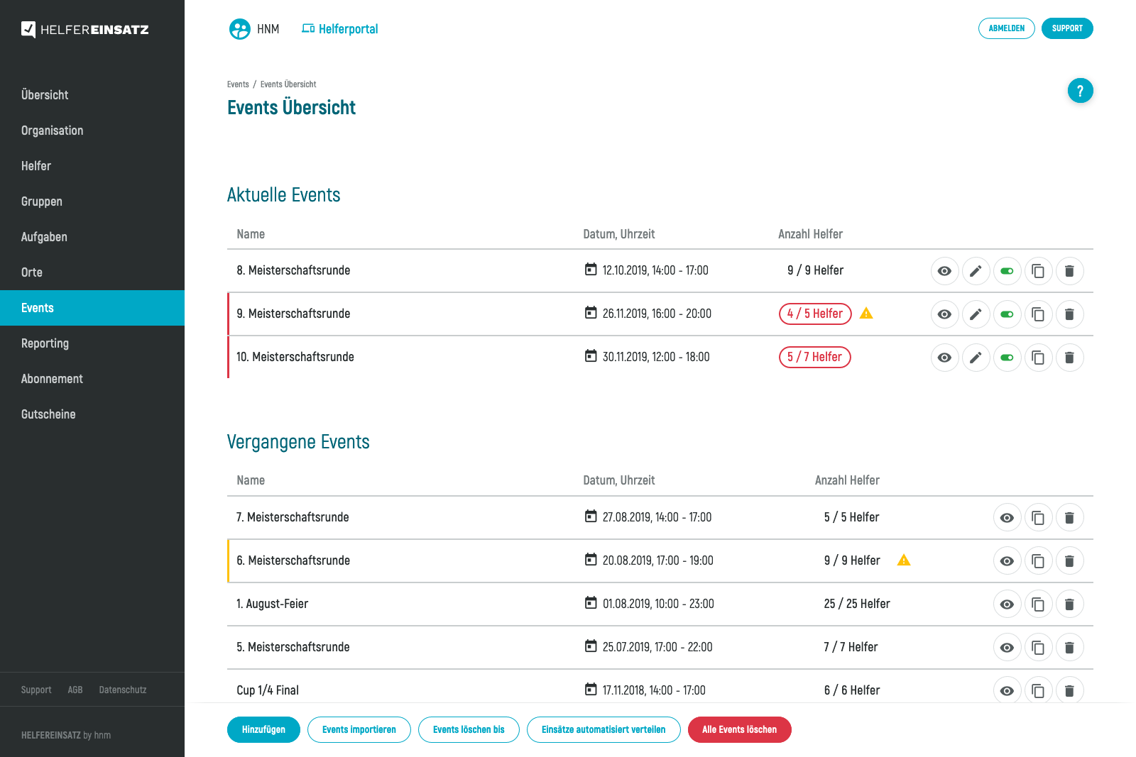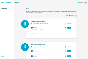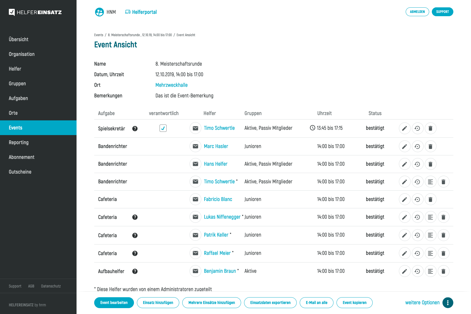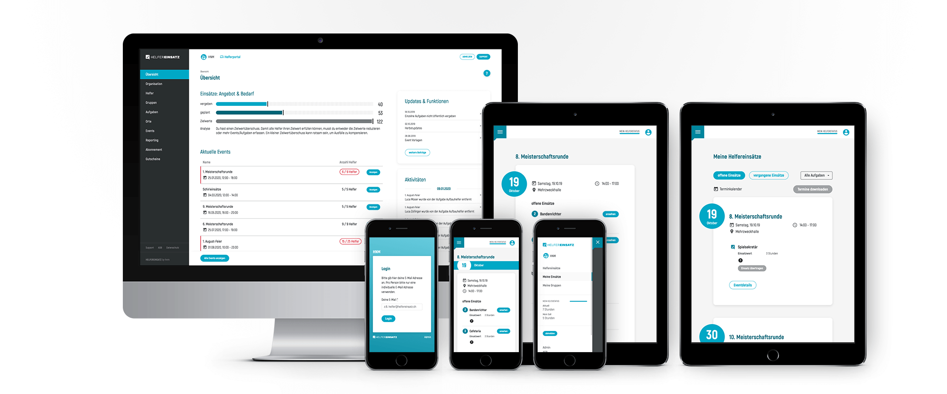 Mit der plattfomunabhängigen Webapp Helfereinsatz organisieren Vereine und Organisationen eigene Events spielend leicht. Anmelden, User importieren oder manuell hinzufügen und die Eventorganisation starten. User werden über anstehende Events informiert und können sich entsprechend Ihrer Möglichkeiten für die verfügbaren Aufgaben eintragen.