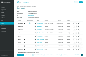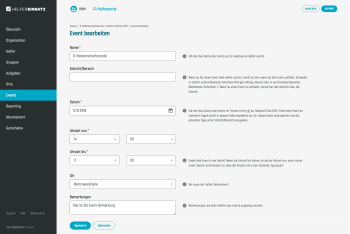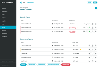 Helfereinsatz bietet ein einfaches Administrations-Interface zum Verwalten von Events. Das Rollen-Rechte-Management sorgt hierbei dafür, dass Mitglieder eine reduzierte Ansicht mit der Ansicht aller anstehenende Events erhalten. Ein eingeschränkter Personenkreis sorgt in einem ausführlicheren Interface für die digitale Organisation der Events.