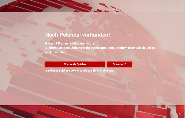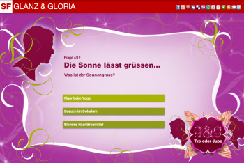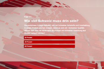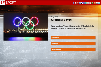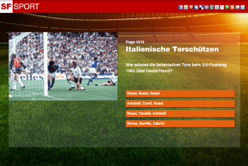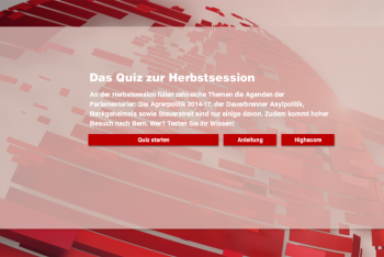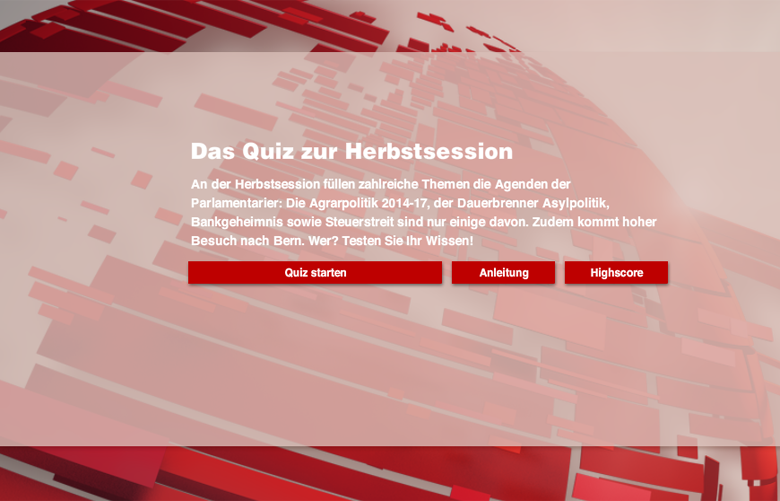 Das Schweizer Fernsehen hat mit dieser Applikation die Möglichkeit, zu x-beliebigen Themen Quizfragen zu erstellen. So kann diese Applikation mehrmals eingesetzt werden. Auch das Design kann angepasst und das Quiz damit für jeden Einsatz individuell gestaltet werden.